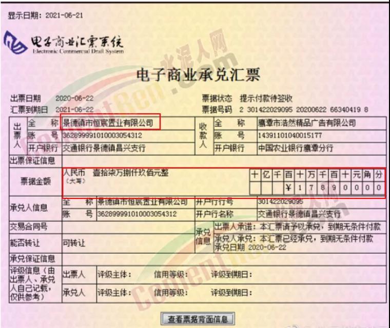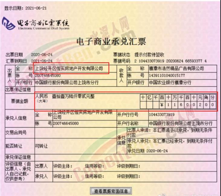2021年6月22日,由江西恒大地產簽發的商業承兌匯票多張到期不兌付,景德鎮市恒宸置業、景德鎮德泰房地產、上海經開區恒實房地產均存在未兌付票據共計46.3萬元,商戶愿意接受恒大的票據是對恒大的信任,然而事實卻是這份難得的信任也遭到了踐踏。