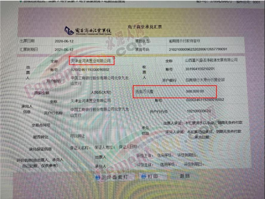 山西富興盛潔凈能源公司員工稱,公司因業務往來收到多張由實地地產集團(天津金河灣置業有限公司)簽發和承兌的商業承兌匯票,卻遲遲沒有付款,已知款項50萬。