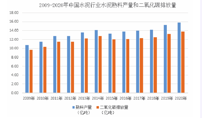 十多年來,水泥熟料產量逐年遞增,中國水泥行業碳排放從9.71億噸逐步達到13.75億噸,水泥行業的碳排放量占全國碳排放總量約13.5%。隨著我國水泥行業資源、能源利用化水平的提高,節能降耗先進技術的應用,嚴禁新增產能、產能減量置換、兼并聯合重組和常態化錯峰生產等有效的鞏固去產能政策的推行,利用環保、質量、能源、技術、安全等綜合標準推動落后產能淘汰,水泥行業在“十三五”向“十四五”過渡期間碳排放有逐漸達到峰值的趨勢。