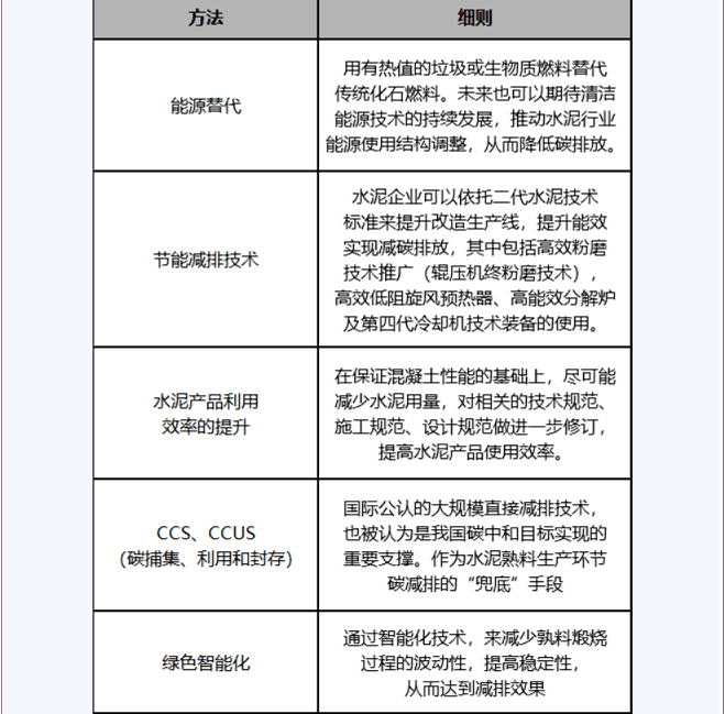 水泥行業是二氧化碳排放大戶,其排放主要來碳酸鹽的分解、燃料的燃燒和電力消耗。進一步在生產工藝碳減排(如替代原料、熟料替代技術等)、生產能耗碳減排(如替代燃料、富氧燃燒技術、高效粉磨、余熱發電等)、新技術碳減排(如水泥窯二氧化碳捕集利用)及新能源技術等方面加強技術研發力度。