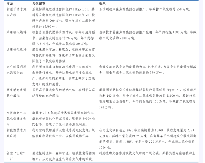 以海螺水泥為例,公司通過一系列手段降低碳排放實現碳中和,2020年預期將噸熟料二氧化碳排放較2016年減少0.004噸,2025年預期將噸熟料二氧化碳排放較2020年下降0.0031噸。同時引進新技術將二氧化碳廢氣轉化為二氧化碳產品。根據水泥網報道,海螺水泥通過一系列手段降低碳排放實現碳中和。如新型干法水泥生產線、富氧助力水泥熟料煅燒和水泥窯煙氣二氧化碳捕集利用等方法。其中水泥窯煙氣二氧化碳捕集利用技術擁有世界首條水泥窯煙氣二氧化碳捕集純化示范項目,規模為50000噸CO2/年,實現了二氧化碳資源化利用。