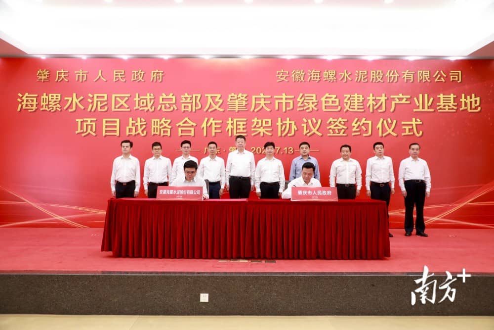 7月13日,肇慶市與安徽海螺水泥股份有限公司簽訂海螺水泥區域總部及肇慶市綠色建材產業基地項目戰略合作框架協議,雙方將在綠色建材產業等領域開展全面深化合作,共同打造國內一流的新型建材領域科技創新和產業發展平臺。