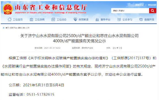 濟(jì)寧山水水泥、棗莊山水水泥分別退出2500t/d、3000t/d熟料生產(chǎn)線各一條,用于在山東棗莊市臺(tái)兒莊區(qū)新建一條4000t/d熟料生產(chǎn)線,新建生產(chǎn)線計(jì)劃點(diǎn)火投產(chǎn)時(shí)間為2024年12月,置換比例為1.25:1