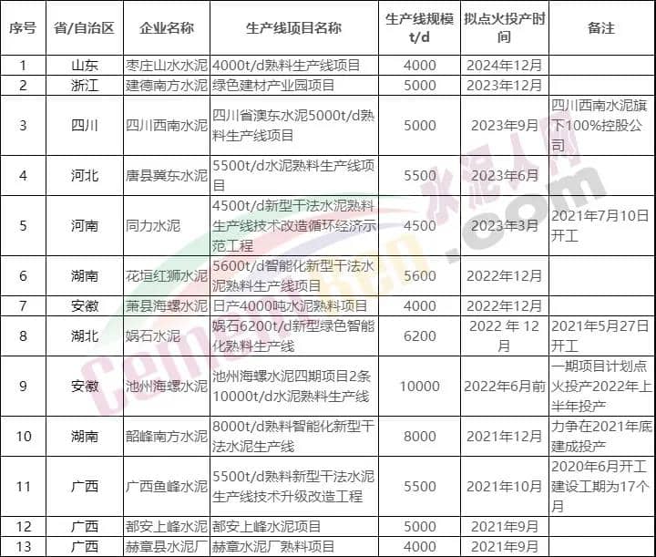 據(jù)水泥人網(wǎng)了解,近期多個(gè)新建水泥熟料生產(chǎn)線項(xiàng)目集中開(kāi)工,也有多個(gè)項(xiàng)目正處于加緊建設(shè)中,多個(gè)項(xiàng)目即將點(diǎn)火投產(chǎn),更有多個(gè)項(xiàng)目公示公告產(chǎn)能置換。