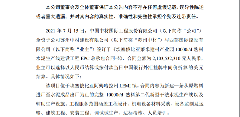 7月15日,中材國(guó)際(600970)發(fā)公告稱,中國(guó)中材國(guó)際工程股份有限公司全資子公司蘇州中材建設(shè)有限公司(以下簡(jiǎn)稱“蘇州中材”)與西部國(guó)際控股有限公司(以下簡(jiǎn)稱“業(yè)主”)簽訂了《埃塞俄比亞萊米建材產(chǎn)業(yè)園10000t/d熟料水泥生產(chǎn)線建設(shè)工程EPC總承包合同書》,合同金額為2,103,532,310元人民幣,業(yè)主可以選擇以人民幣結(jié)算或按付款當(dāng)日中國(guó)銀行外匯掛牌中間價(jià)折算的美元結(jié)算。具體情況如下: