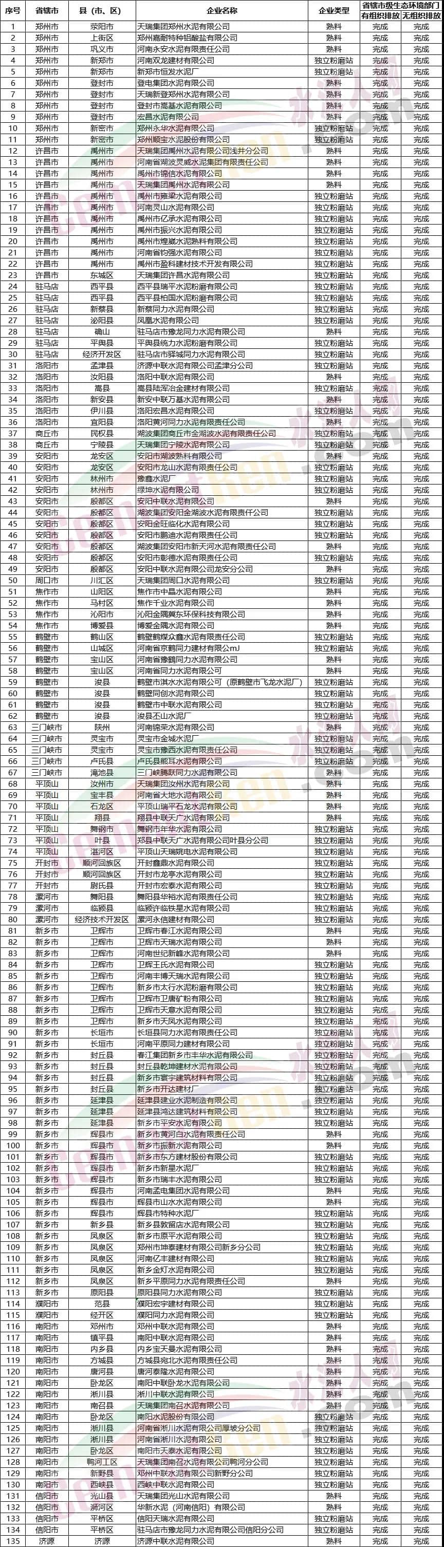 方案發(fā)布后截止至目前,河南省已有135家水泥企業(yè)完成水泥超低排放改造評估監(jiān)測。具體名單如下: