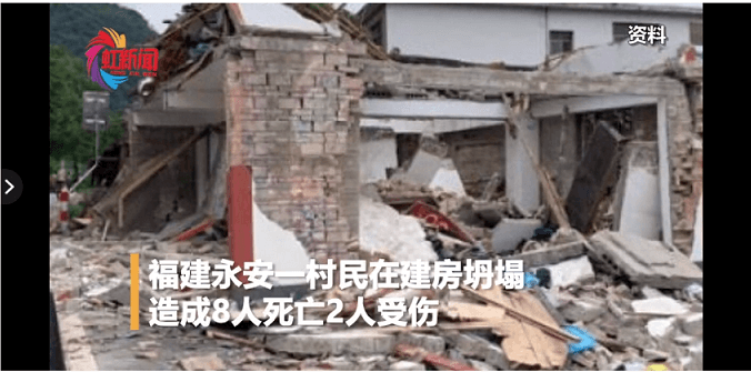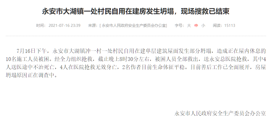 7月16日下午,福建三明永安市大湖鎮沖一村一處村民自用在建單層建筑屋面發生部分坍塌,造成正在屋內休息的10名施工人員被困。經全力組織搶救,截止晚上8時30分左右,被困人員全部救出,送永安總醫院搶救,其中4人送醫途中不治死亡,4人在醫院搶救無效身亡,2名傷者目前生命體征平穩。目前善后工作已全面展開,房屋坍塌原因正在調查中。
