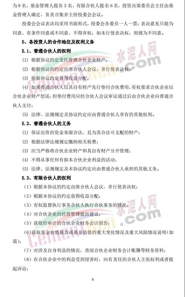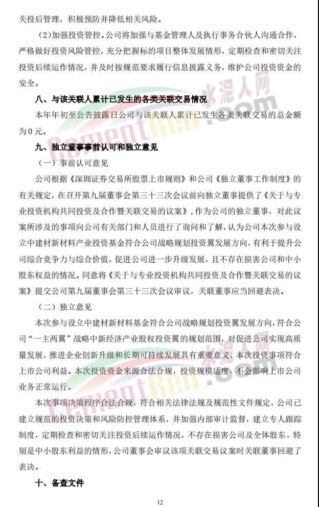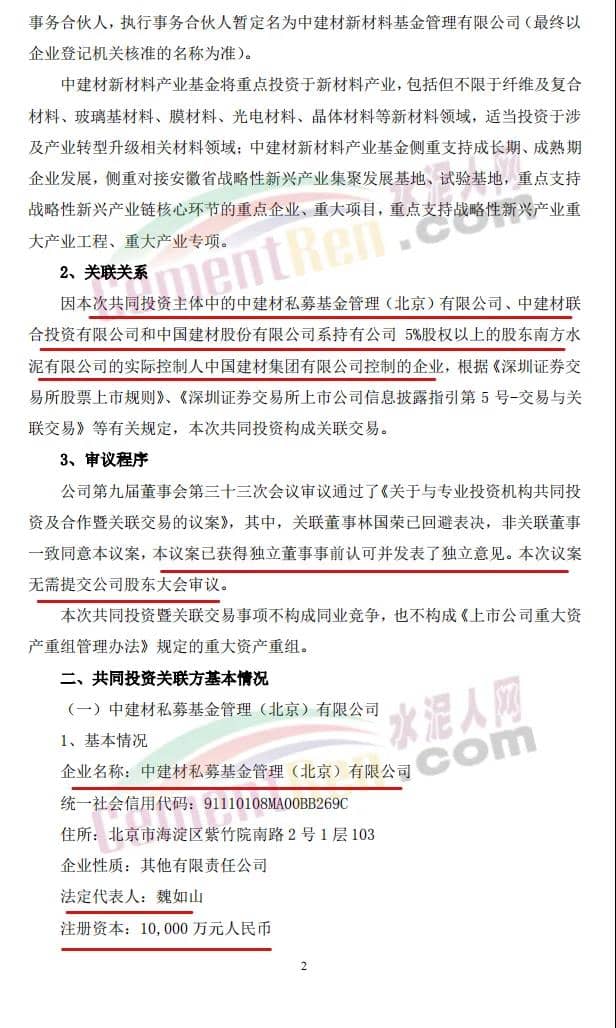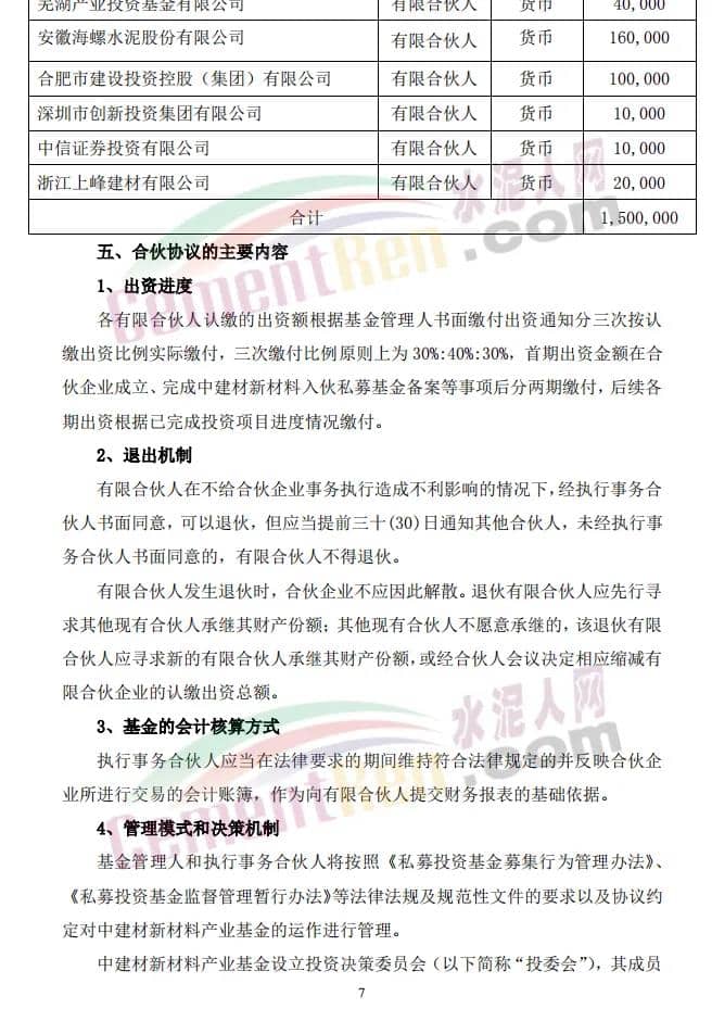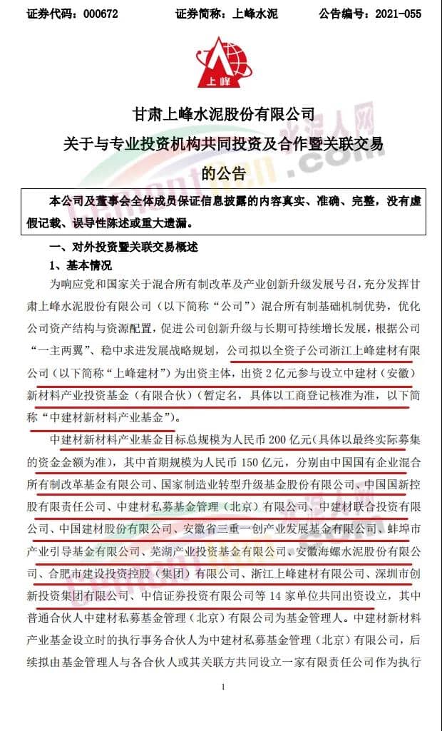 16日,上峰水泥發(fā)布《關(guān)于與專業(yè)投資機(jī)構(gòu)共同投資及合作暨關(guān)聯(lián)交易的公告》稱,公司擬以全資子公司浙江上峰建材有限公司(以下簡稱“上峰建材”)為出資主體,出資2億元參與設(shè)立中建材(安徽)新材料產(chǎn)業(yè)投資基金(有限合伙)(暫定名,具體以工商登記核準(zhǔn)為準(zhǔn),以下簡稱“中建材新材料產(chǎn)業(yè)基金”)。