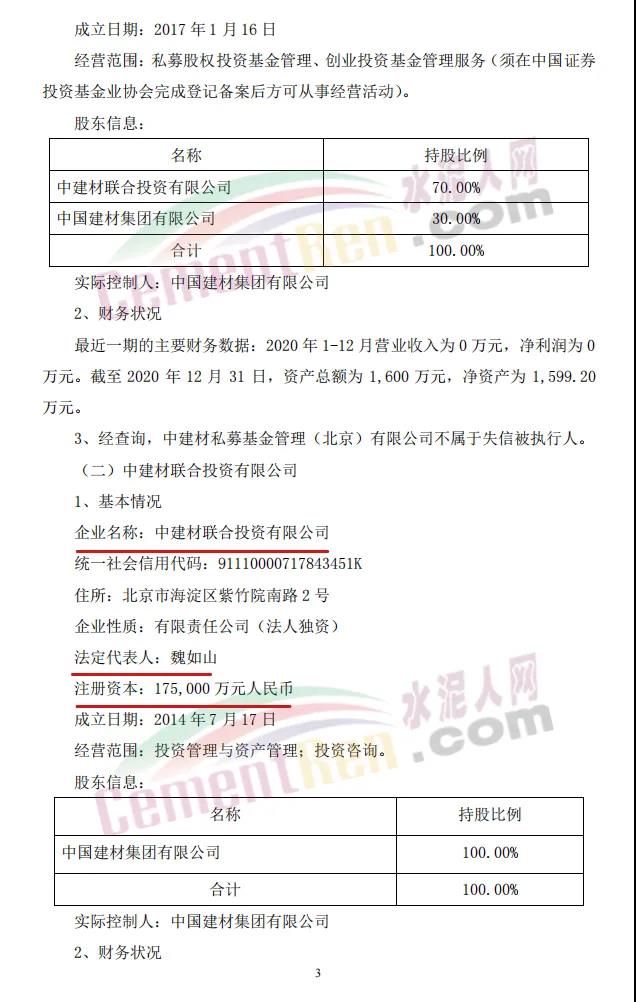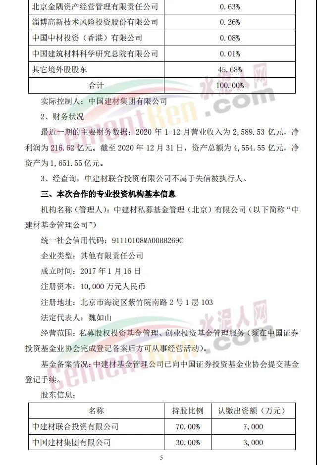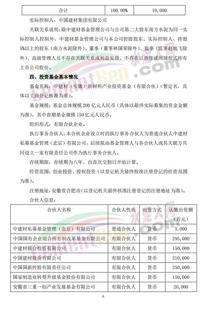 中建材新材料產(chǎn)業(yè)基金目標(biāo)總規(guī)模為人民幣200億元(具體以最終實(shí)際募集的資金金額為準(zhǔn)),其中首期規(guī)模為人民幣150億元,由14家單位共同出資設(shè)立,普通合伙人中建材私募基金管理(北京)有限公司為基金管理人,基金將重點(diǎn)投資于新材料產(chǎn)業(yè),包括但不限于纖維及復(fù)合材料、玻璃基材料、膜材料、光電材料、晶體材料等新材料領(lǐng)域。