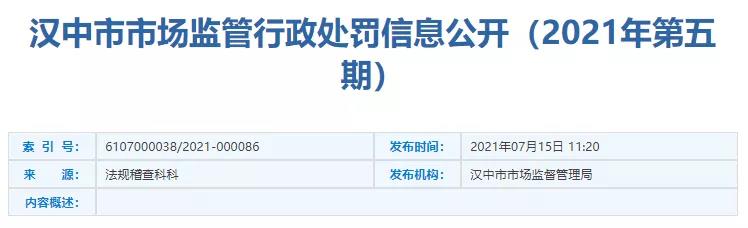 做出處罰的機(jī)關(guān)名稱和日期:漢中市市場(chǎng)監(jiān)督管理局2021年6月22日
