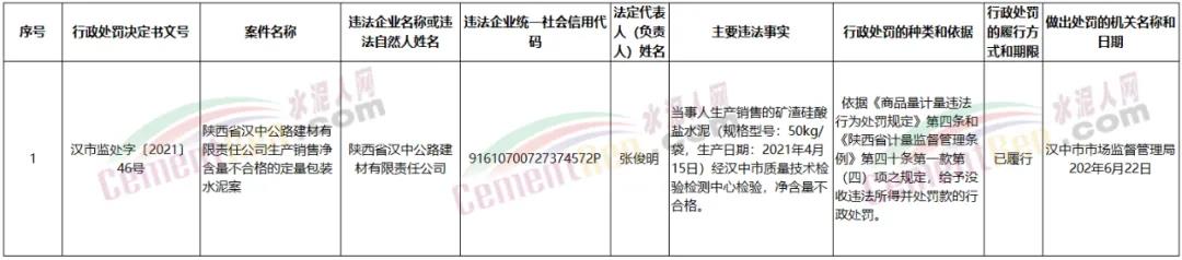 7月15日,陜西漢中市市場(chǎng)監(jiān)管局網(wǎng)站發(fā)布行政處罰信息公開(kāi)表,涉及陜西省漢中公路建材有限責(zé)任公司生產(chǎn)銷(xiāo)售凈含量不合格的定量包裝水泥案。