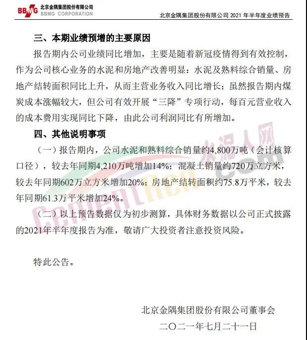 日前,北京金隅集團股份有限公司發布《2021年半年度業績預告》,預告顯示,金隅集團預計2021年上半年實現歸屬于上市公司股東的凈利潤為18.5億元-19.5億元,同比增長21%-28%。