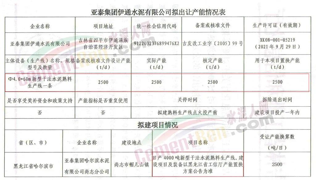 日前,吉林省工信廳發布《關于對亞泰集團伊通水泥有限公司2500t/d水泥熟料生產線能指標出讓的公示》顯示,亞泰集團伊通水泥有限公司2500t/d水泥熟料生產線能指標擬出讓至亞泰集團哈爾濱水泥有限公司尚志分公司用于新建一條4000t/d新型干法水泥熟料生產線。退出項目將于建設項目投產一年內拆除。