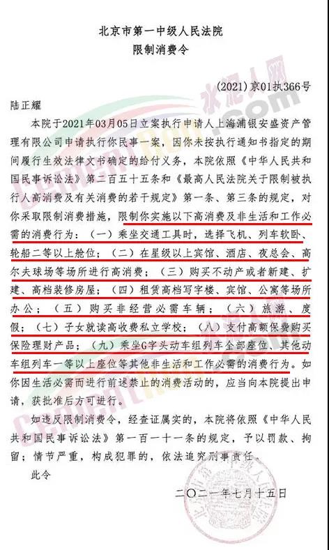 日前,水泥人網(wǎng)從中國執(zhí)行信息公開網(wǎng)獲悉,7月15日,陸正耀新增一則限制消費令信息,申請人為上海浦銀安盛資產(chǎn)管理有限公司,發(fā)布法院為北京市第一中級人民法院。關(guān)聯(lián)執(zhí)行案件立案時間為2021年3月5日,執(zhí)行標(biāo)的超9.35億元。據(jù)天眼查,陸正耀是瑞幸咖啡創(chuàng)始人、神州租車創(chuàng)始人,其名下還有神州優(yōu)車等公司。限制實施以下高消費及非生活和工作必需的消費行為∶
