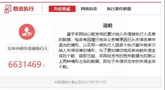 中國執(zhí)行信息公開網(wǎng)消息,截止2021年7月17日公布的失信被執(zhí)行人達(dá)6631469個。