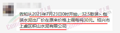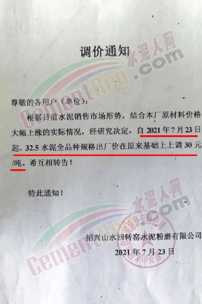 紹興山水回轉窯水泥粉磨有限公司通知,自7月23日起32.5水泥全品種規格出廠價在原基礎上上調30元/噸。