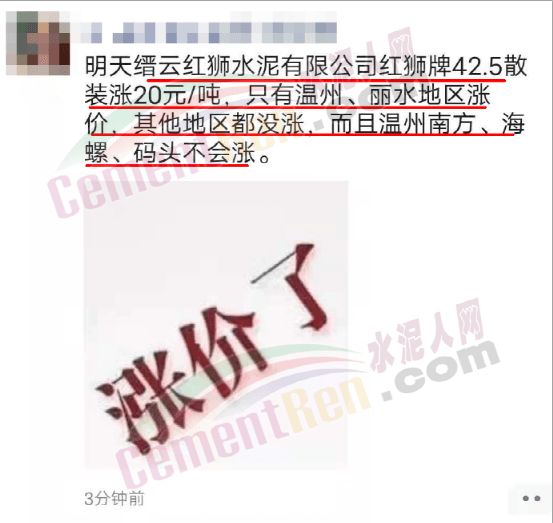 浙江溫州、麗水紅獅、南方、海螺等企業集體漲價20元/噸