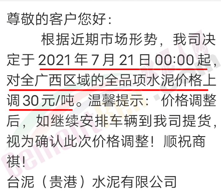 臺泥(貴港)水泥有限公司通知2021年7月21日0時起,對全廣西區域的全品項水泥價格上調30元/噸。