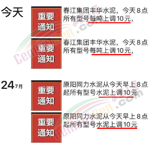 水泥人網(wǎng)通訊員消息,自24日原陽同力通知上調(diào)所有型號水泥價格10元/噸后,昨日(26日)春江集團(tuán)豐華水泥也通知所有型號水泥上調(diào)10元/噸。