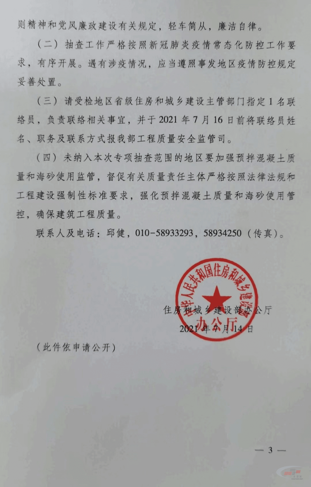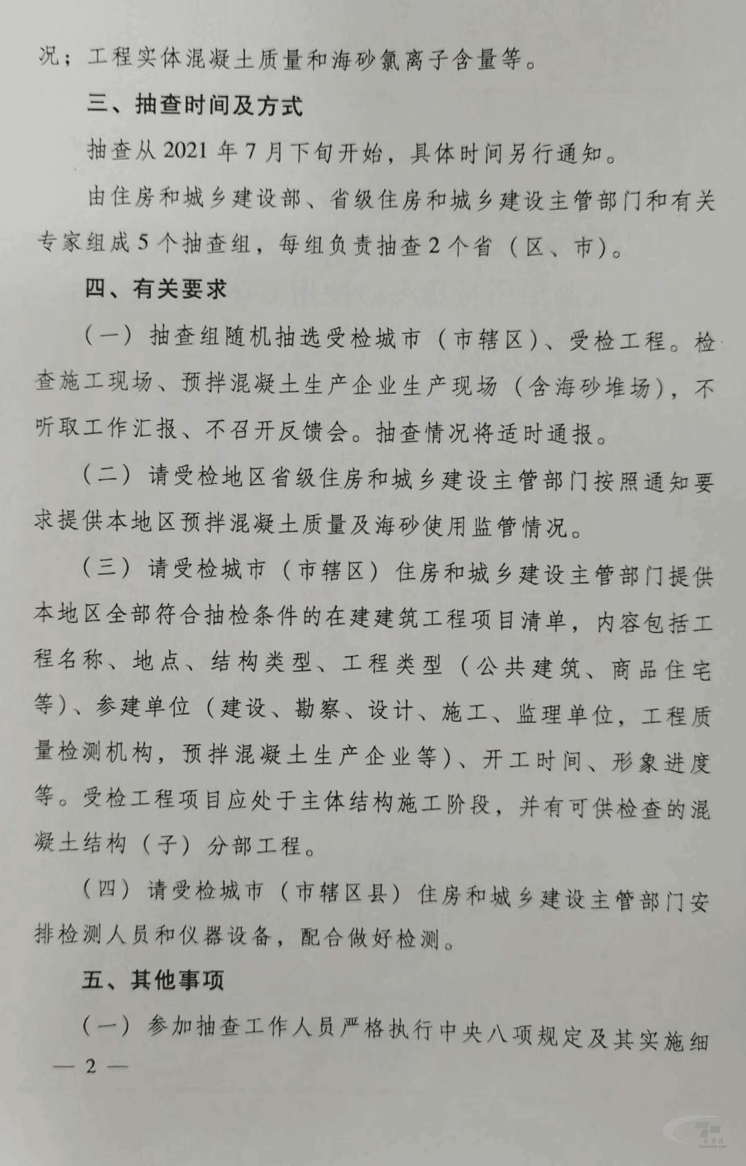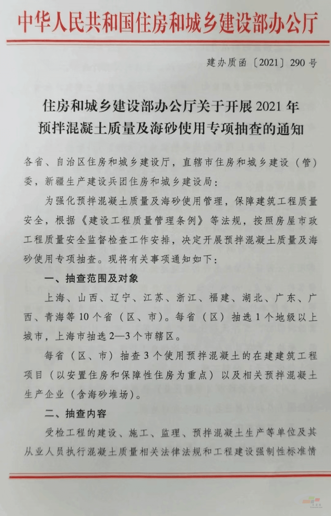 近日,住建部發布關于開展2021預拌混凝土質量及海砂使用專項檢查通知。