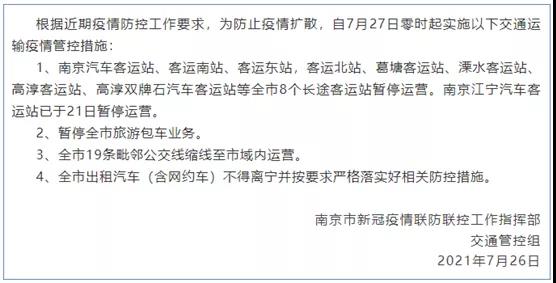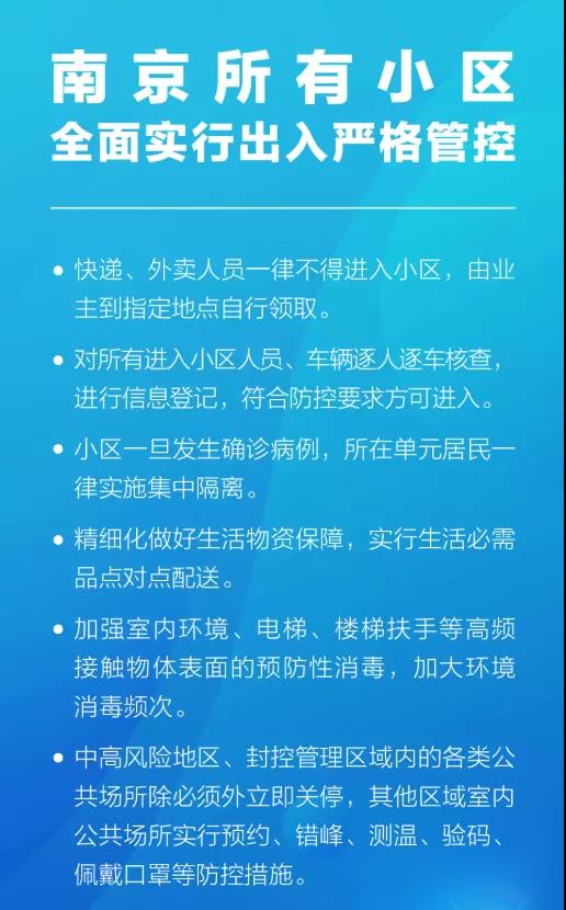 26日晚,江蘇省南京市新冠肺炎疫情聯防聯控指揮部社會和社區(qū)防控組發(fā)布通告:即日起,南京所有小區(qū)全面實行出入嚴格管控,快遞、外賣人員一律不得進入小區(qū),由業(yè)主到指定地點自行領取。27日零時起,南京暫停運營全市8個長途客運站,暫停全市旅游包車業(yè)務,全市19條毗鄰公交線縮線至市域內運營,全市出租汽車(含網約車)不得離寧并按要求嚴格落實好相關防控措施。