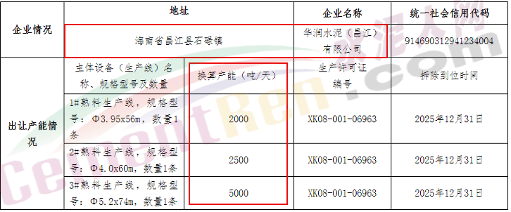 現將華潤水泥(昌江)有限公司水泥熟料產能置換出讓情況予以公告。