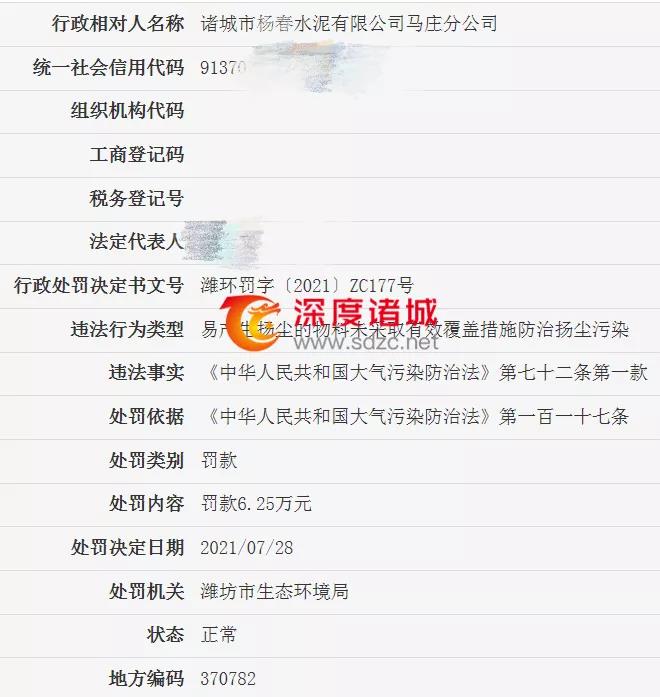 諸城市楊春水泥有限公司馬莊分公司被罰48.75萬元