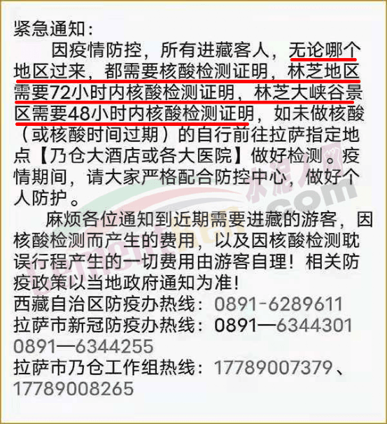 西藏地區(qū)緊急通知∶因疫情防控,所有進(jìn)藏客人,無論哪個地區(qū)過來,都需要核酸檢測證明,林芝地區(qū)需要72小時內(nèi)核酸檢測證明,林芝大峽谷景區(qū)需要48小時內(nèi)核酸檢測證明,如未做核酸(或核酸時間過期)的自行前往拉薩指定地點(diǎn)做好檢測。