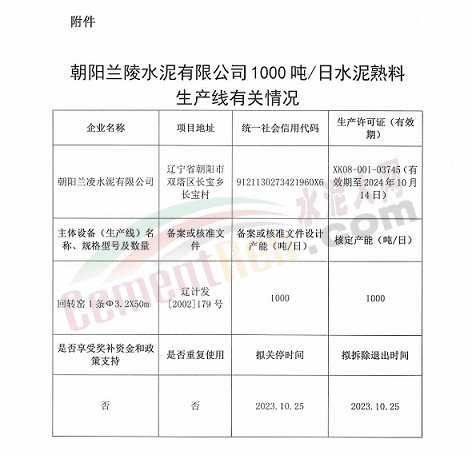 7月30日,遼寧省工信廳發布關于朝陽蘭陵水泥有限公司1000噸/日水泥熟料生產線遷建的公示。方案經朝陽市同意、企業和葫蘆島市申請,擬將朝陽蘭陵水泥有限公司1000噸/日水泥熟料生產線遷建至葫蘆島市南票區,原址生產線計劃在2023年10月25日關停,公示如下: