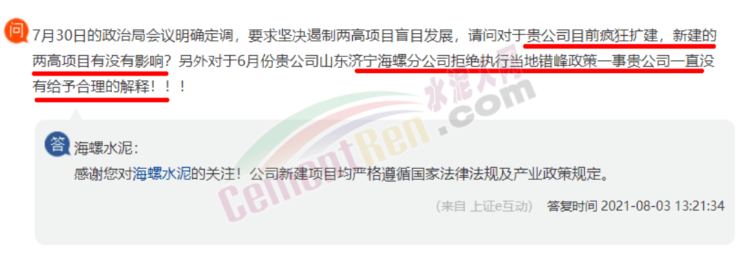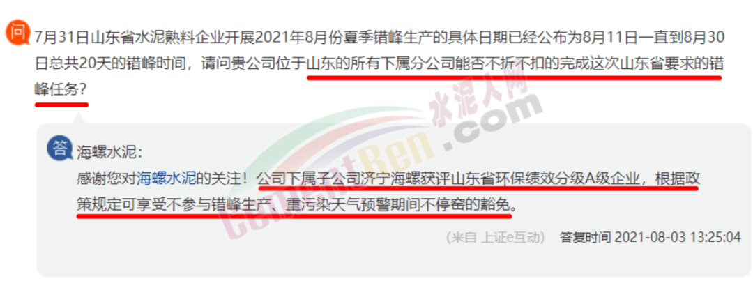 日前,有股友在上市平臺向海螺水泥提問,“7月31日山東省水泥熟料企業開展2021年8月份夏季錯峰生產的具體日期已經公布為8月11日一直到8月30日總共20天的錯峰時間,請問貴公司位于山東的所有下屬分公司能否不折不扣的完成這次山東省要求的錯峰任務?”