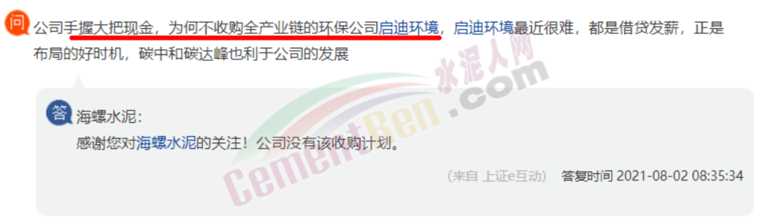 還有股友給海螺水泥支招收購啟迪環境,并稱啟迪環境最近很難,借貸發薪,正是布局的好時機,碳中和,碳達峰也利于公司的發展。海螺水泥回復稱,公司沒有該收購計劃。