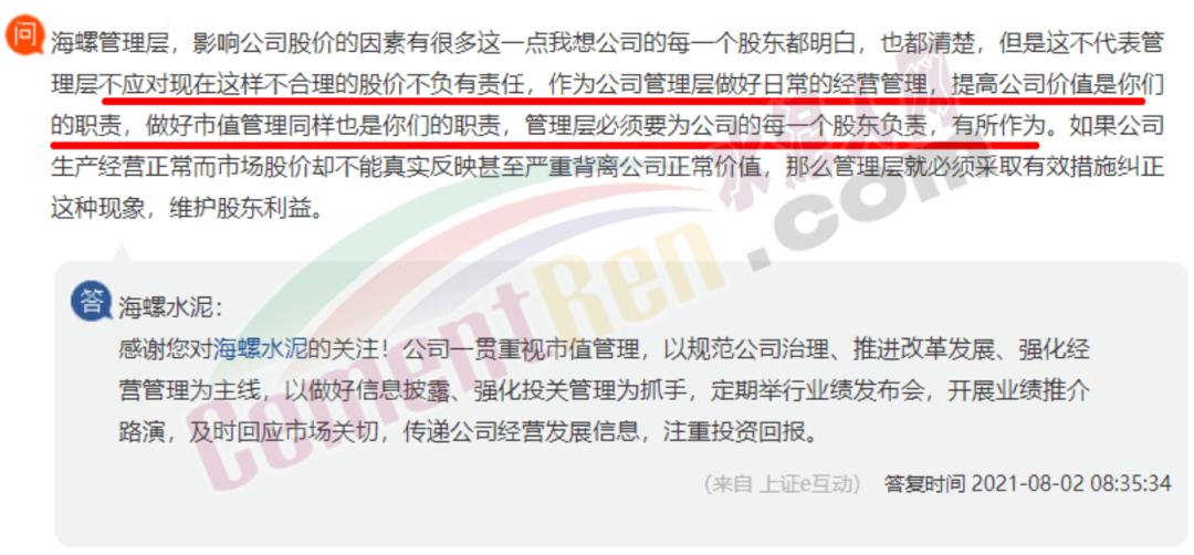 更有股民對海螺管理層直言稱:“影響公司股價的因素有很多這一點公司的每一個股東都明白,也都清楚,但是這不代表管理層不應對現在這樣不合理的股價不負有責任,作為公司管理層做好日常的經營管理,提高公司價值是你們的職責,做好市值管理同樣也是你們的職責,管理層必須要為公司的每一個股東負責,有所作為。如果公司生產經營正常而市場股價卻不能真實反映甚至嚴重背離公司正常價值,那么管理層就必須采取有效措施糾正這種現象,維護股東利益。”