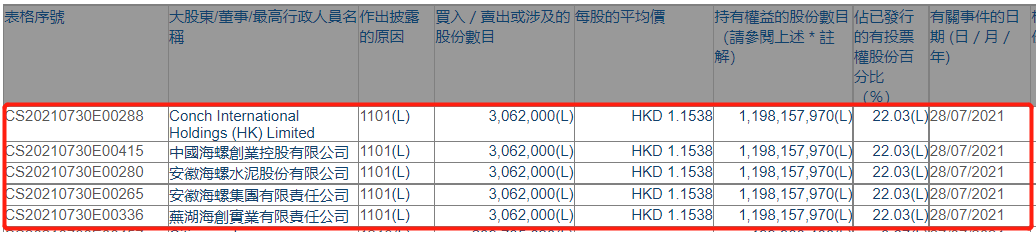 增持后,海螺水泥或其一致行動人最新持股數目為1,198,157,970股,持股比例由21.97%上升至22.03%。