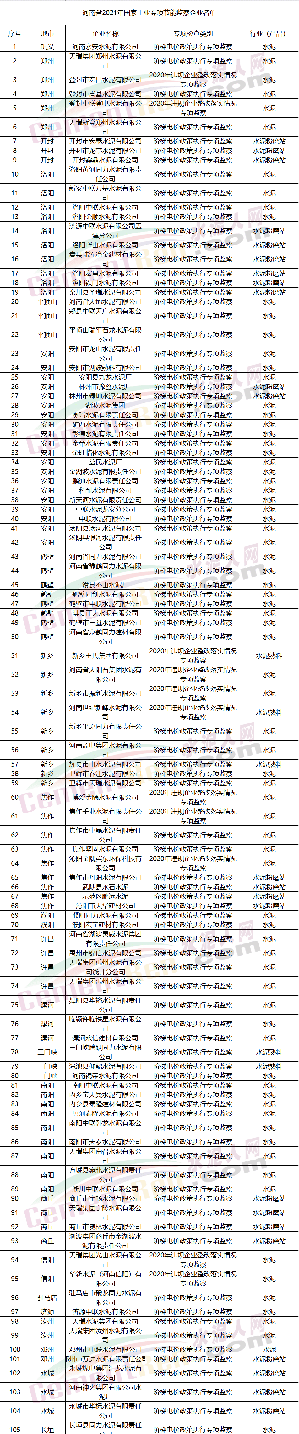 近日,河南省工業和信息化廳發布了《關于下達2021年國家工業專項節能監察任務的通知》,通知顯示:2021年河南省省工業專項節能監察任務總量為238家。其中,105家水泥企業被納入國家工業專項節能監察水泥企業名單,《通知》原文如下: