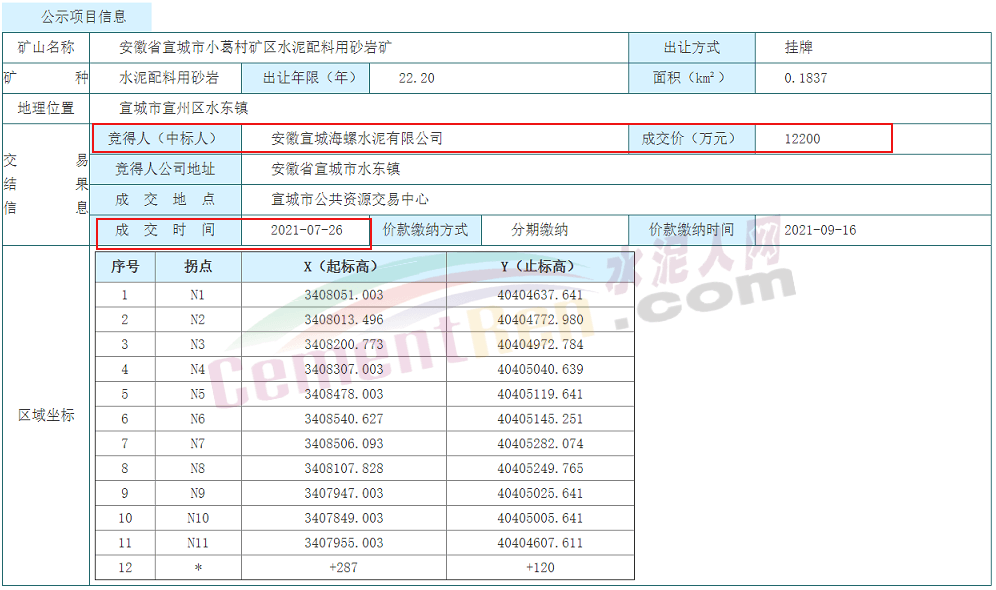 8月4日,中華人民共和國自然資源部發布一則采礦權出讓結果公示,公示內容關于安徽省宣城市小葛村礦區水泥配料用砂巖礦采礦權招拍掛出讓相關事宜,根據公示該采礦權出讓給了安徽宣城海螺水泥有限公司,7月26日以12200萬元成交價中標,詳情如下: