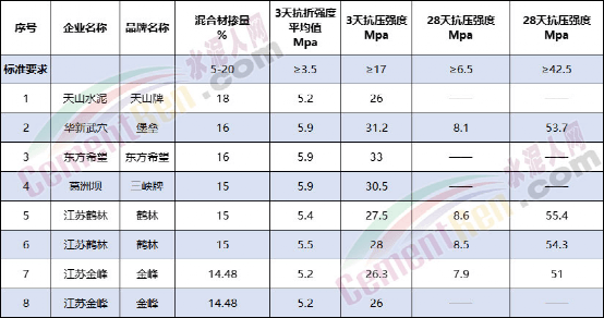 對比天山水泥、華新水泥、東方希望、葛洲壩、江蘇鶴林、江蘇金峰等多家企業,其混合材摻量從14.8-18%,3天抗折強度在5.2-5.9之間,3天抗壓強度在26-31.2之間。