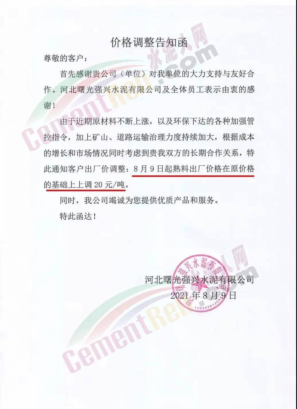 河北曙光強興水泥有限公司通知,由于近期原材料不斷上漲,以及環保下達的各種加強管控指令,加上礦山、道路運輸治理力度持續加大,根據成本的增長和市場情況,自8月9日起熟料出廠價格在原價格的基礎上上調20元/噸。