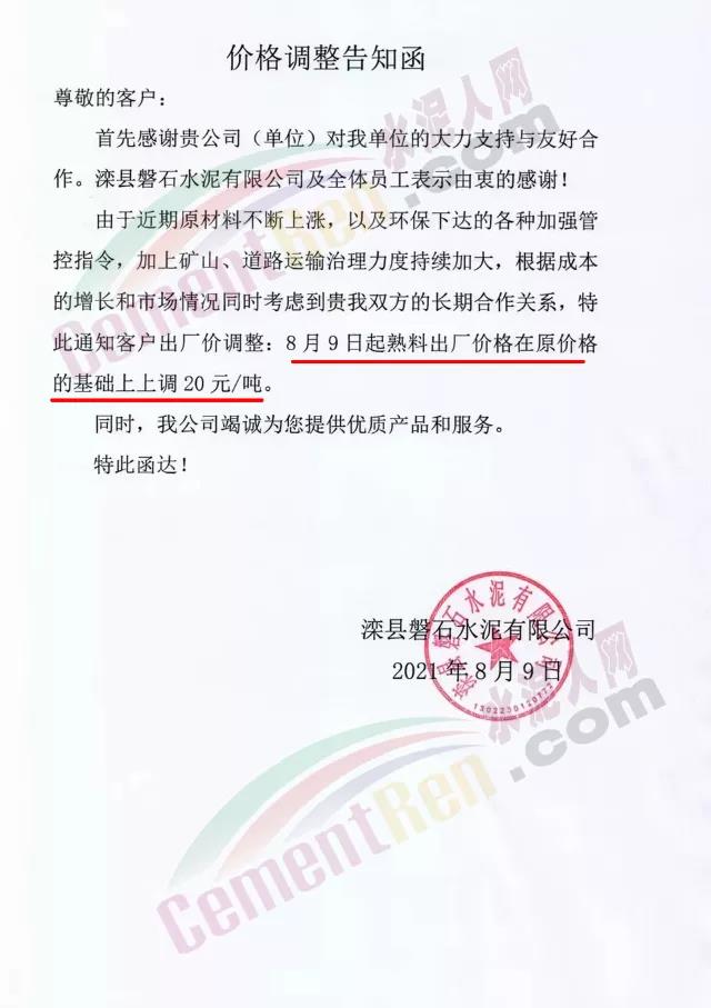 灤縣磐石水泥有限公司通知,由于近期原材料不斷上漲,以及環保下達的各種加強管控指令,加上礦山、道路運輸治理力度持續加大,根據成本的增長和市場情況自8月9日起熟料出廠價格在原價格的基礎上上調20元/噸。