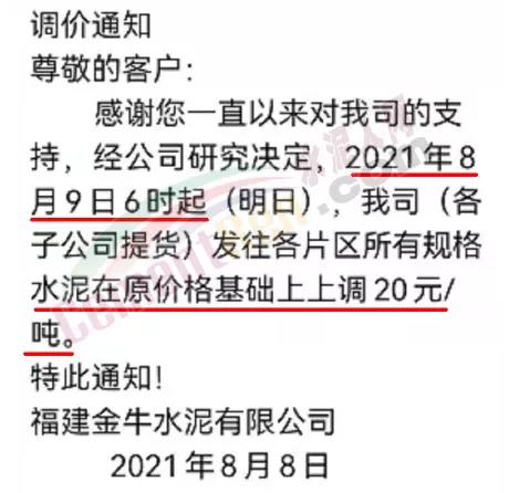 同日福建省內福建水泥、金牛水泥等多家企業通知自8月9日起上調水泥價格20元/噸。
