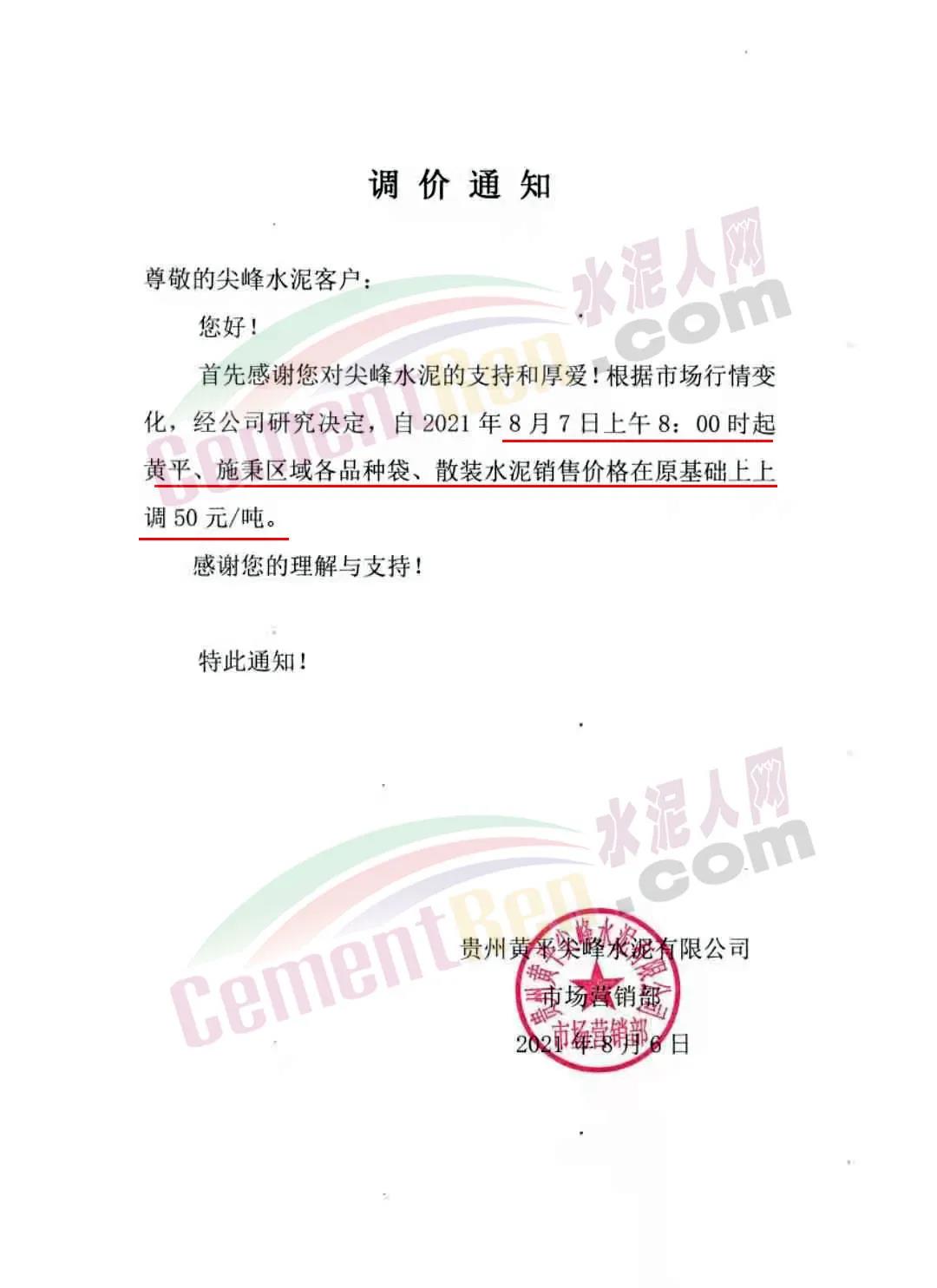 貴州黃平尖峰水泥有限公司市場營銷部通知根據市場行情變化,經公司研究決定,自2021年8月7日上午8時起黃平、施秉區域各品種袋、散裝水泥銷售價格在原基礎上上調50元/噸。