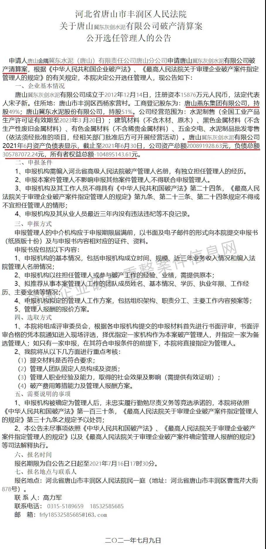 據(jù)水泥人網(wǎng)此前報(bào)道,7月9日河北省唐山市豐潤(rùn)區(qū)人民法院發(fā)布《關(guān)于唐山冀東灰劍水泥有限公司破產(chǎn)清算案公開選任管理人的公告》稱,申請(qǐng)人唐山金隅冀東水泥(唐山)有限責(zé)任公司唐山分公司申請(qǐng)?zhí)粕郊綎|灰劍水泥有限公司破產(chǎn)清算案,河北省唐山市豐潤(rùn)區(qū)人民法院將公開選任管理人。