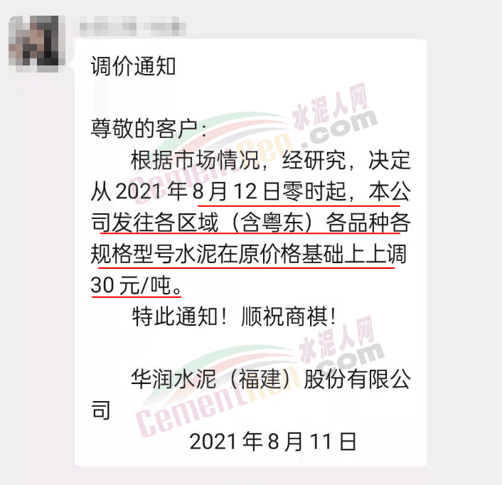 華潤水泥(福建)股份有限公司通知,根據市場情況,經研究決定從8月12日零時起,公司發往各區域(含粵東)各品種各規格型號水泥在原價格基礎上上調30元/噸。
