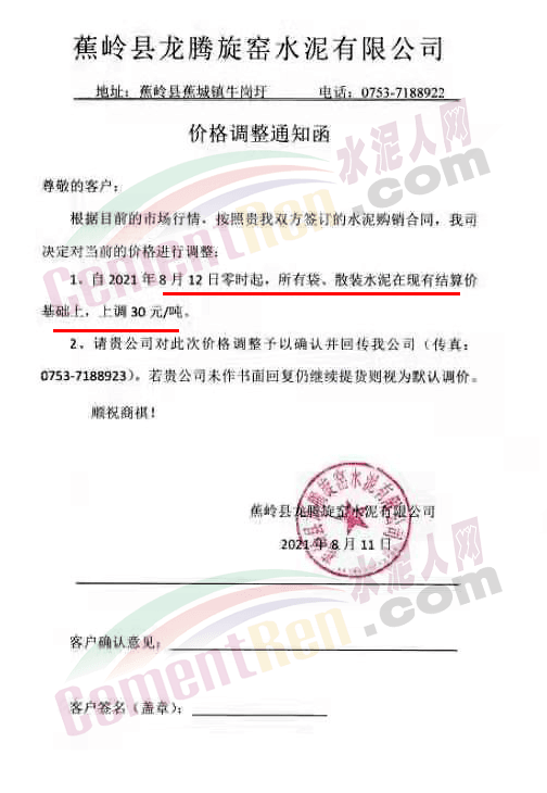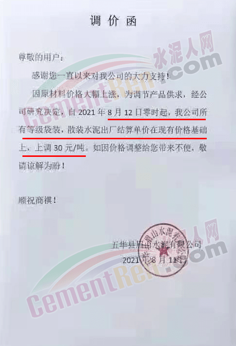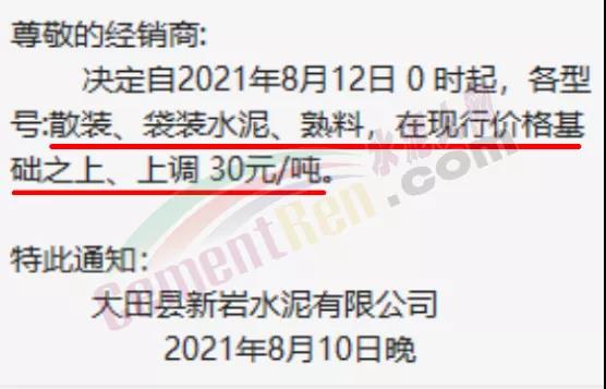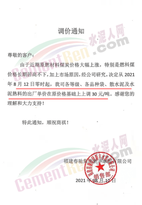 福建春馳集團新豐水泥有限公司通知自8月12日零時起,公司各等級、各品種袋、散裝水泥及熟料在原價基礎上上調30元/噸。