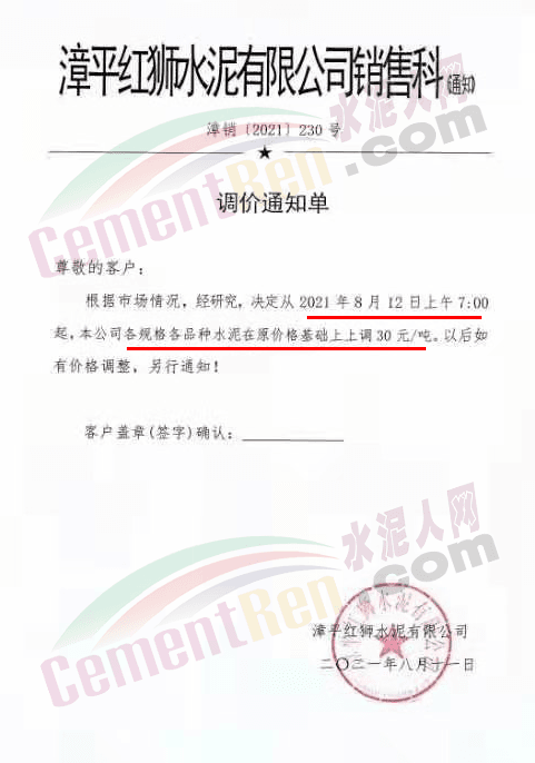 漳平紅獅水泥有限公司銷售科通知,根據市場情況,自8月12日上午7時起,公司各規格品種水泥在原價基礎上上調30元/噸。