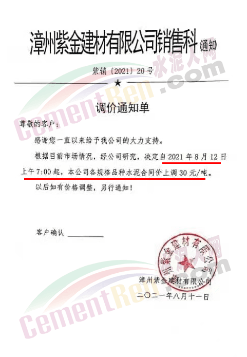 漳州紫金建材有限公司銷售科通知,根據目前市場情況,自8月12日上午7時起,公司各規格品種水泥合同價上調30元/噸。