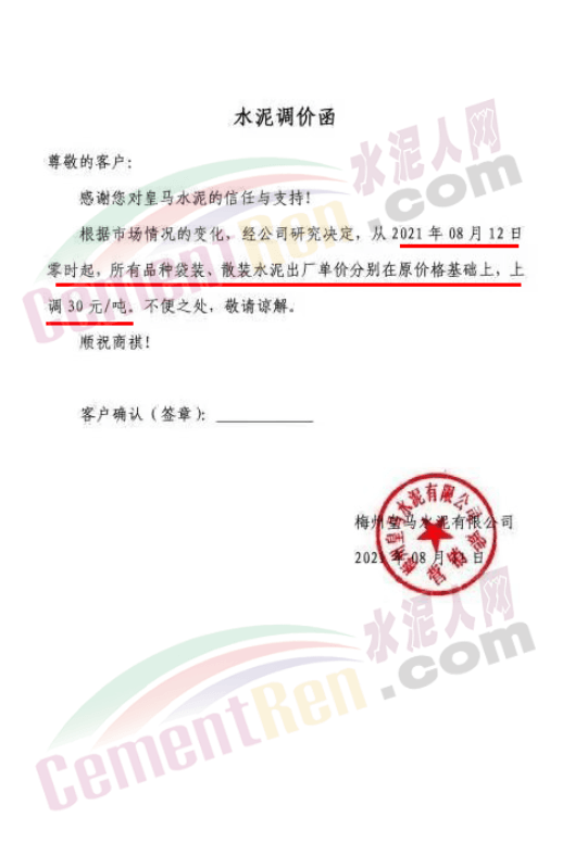 梅州皇馬水泥有限公司通知,自8月12日零時起,所有品種袋裝、散裝水泥出廠價上調30元/噸。
