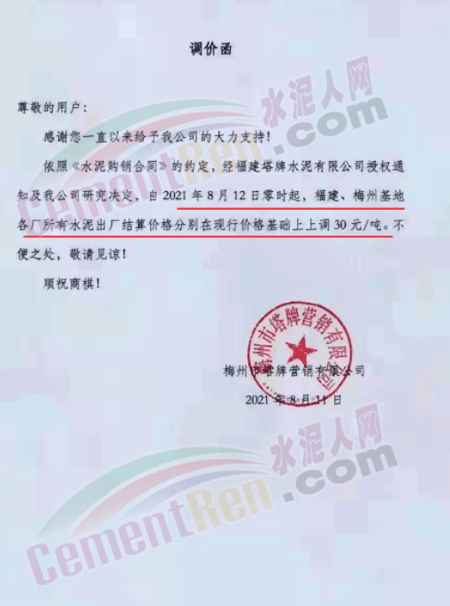 梅州市塔牌營銷有限公司通知,經福建塔牌水泥有限公司授權通知,自8月12日零時起,福建、梅州基地各廠所有水泥出廠結算價上調30元/噸。