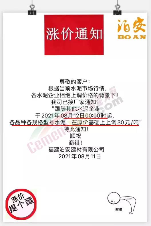 福建泊安建材通知,根據當前水泥市場行情,各水泥企業相繼上調價格的背景下,公司已經接廠家通知,跟隨其他水泥企業于8月12日0時起各品種各規格型號水泥,在原價基礎上上調30元/噸。