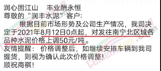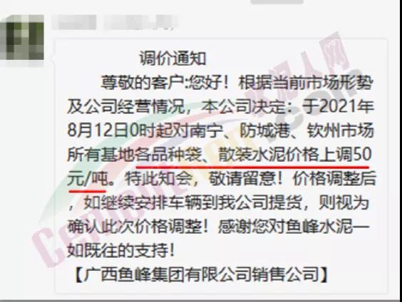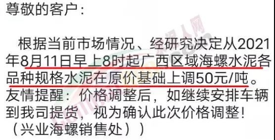 同日,興業海螺水泥通知自8月11日早8時起,廣西區域海螺水泥各品種規格上調50元/噸。
