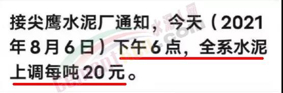 尖鷹水泥廠通知自8月6日下午6時,全系水泥上調20元/噸。